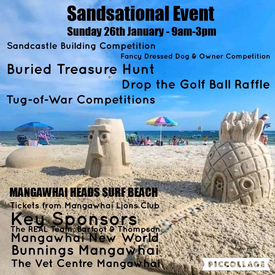 Fun-filled family day out with lots of activities including a Fancy Dressed Dog & Owner Competition, Sand Sculpture Competition, Drop-the-Golf Ball Raffle, Buried Treasure Hunt, Tug-of War.......with great prizes to be won. Entry tickets for the competitions and raffle available from the Mangawhai Lions Club.