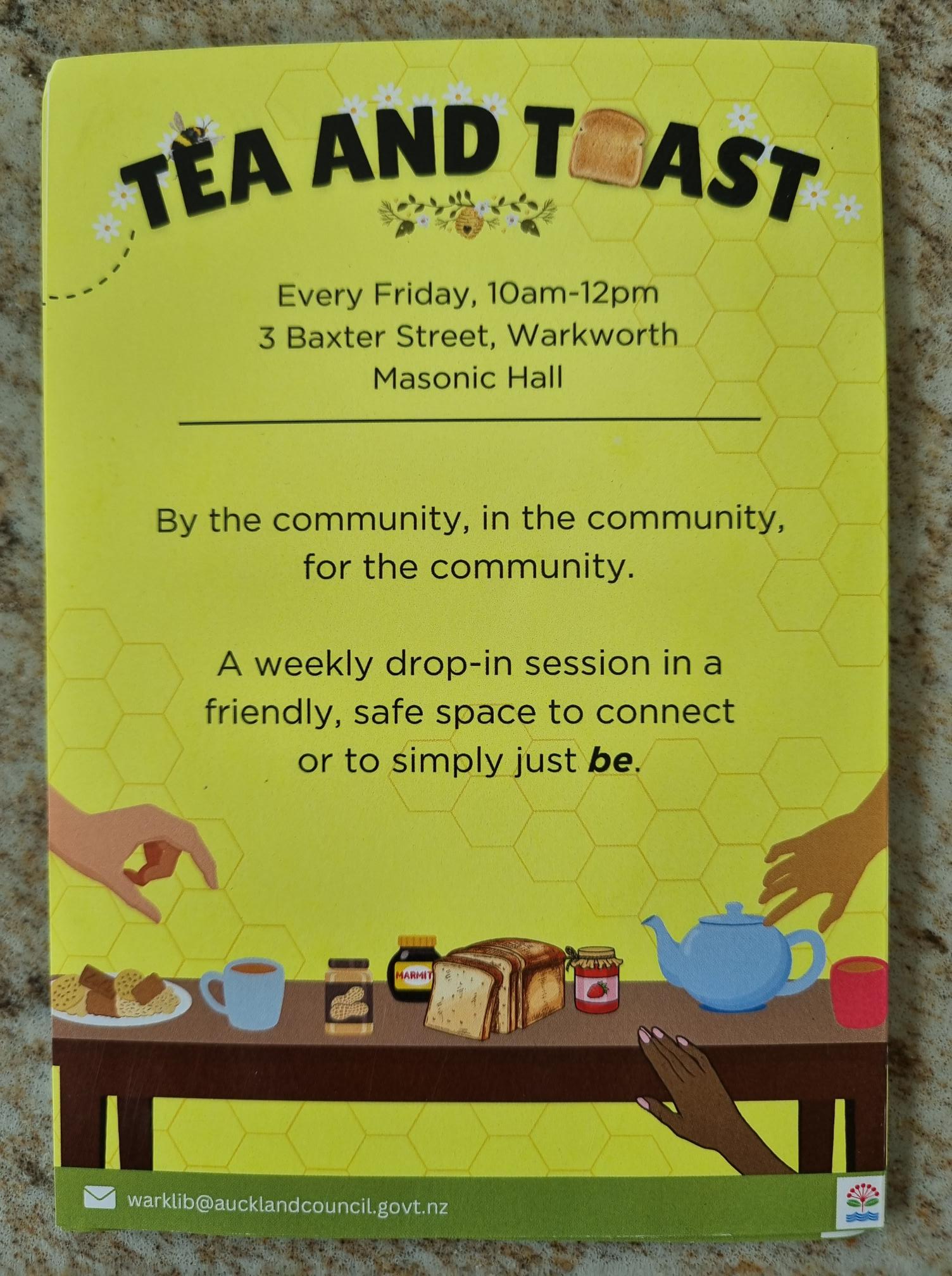 Tea and Toast is a free weekly drop in session in a friendly safe space at Warkworth Masonic Hall from 10-12 noon.