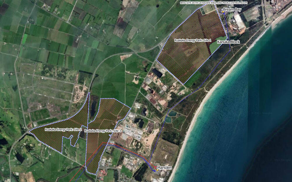 Satellite image showing the three sites of Meridian’s planned Ruakākā Solar Farm. The battery site is at top right. Photo: Supplied / Meridian
