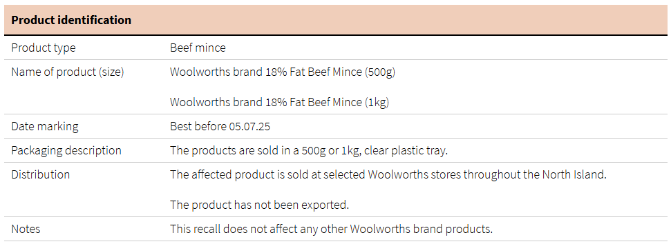 Woolworths New Zealand Ltd is recalling a specific batch of its Woolworths brand 18% Fat Beef Mince as the product may contain foreign matter (soft blue plastic).