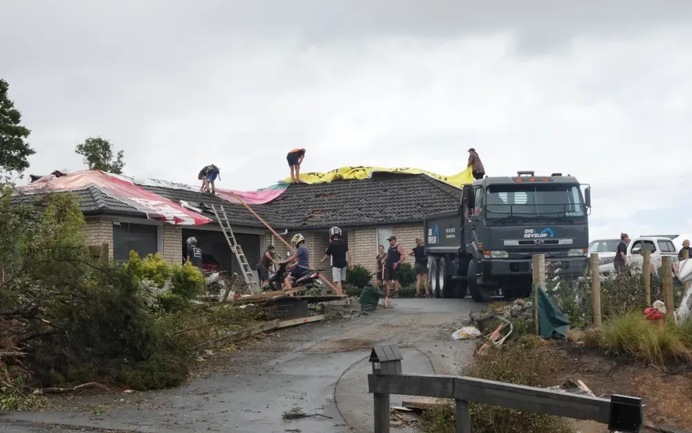 Residents race to get tarps over houses that lost their roofs in the tornado in Mangawhai, 26 January 2025. Photo: Peter de Graaf / RNZ