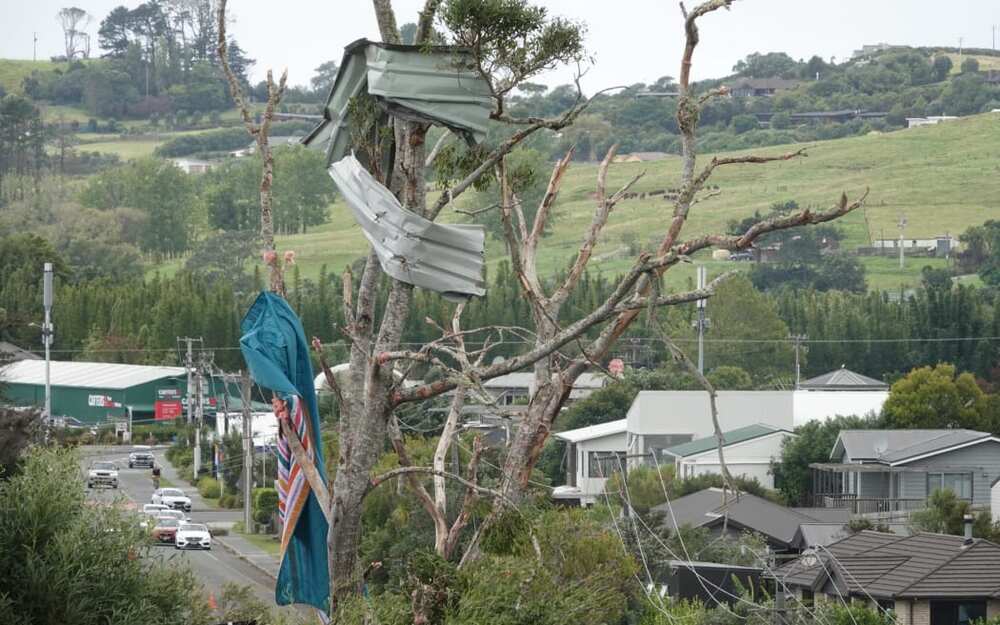 Corrugated iron and duvets in a tree following a storm in Mangawhai, 26 January 2025. Photo: Peter de Graaf / RNZ