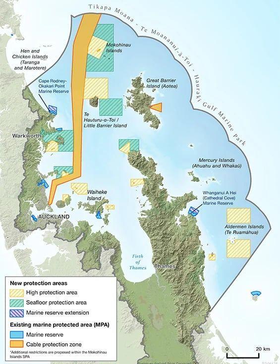The new protection areas are within the Hauraki Gulf Marine Park. The Park is not a protected area. It was established in 2000, under the Hauraki Gulf Marine Park Act, to achieve integrated management of the area across land and sea. The Hauraki Gulf Forum is the statutory body established under this Act.