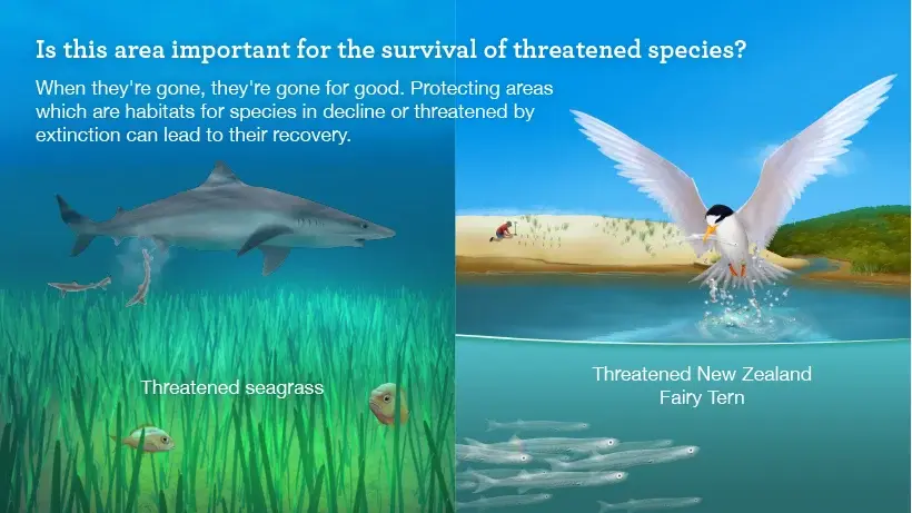 A seafloor protection area would protect habitats created by plants and animals (biogenic). Such as dog cockles, green lipped mussels, and seagrass beds. Learn more about marine habitats.