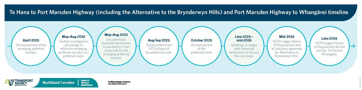 The timeline below shows next steps for Te Hana to Port Marsden Highway (including the Alternative to the Brynderwyn Hills) and Port Marsden Highway to Whangārei over the coming months.