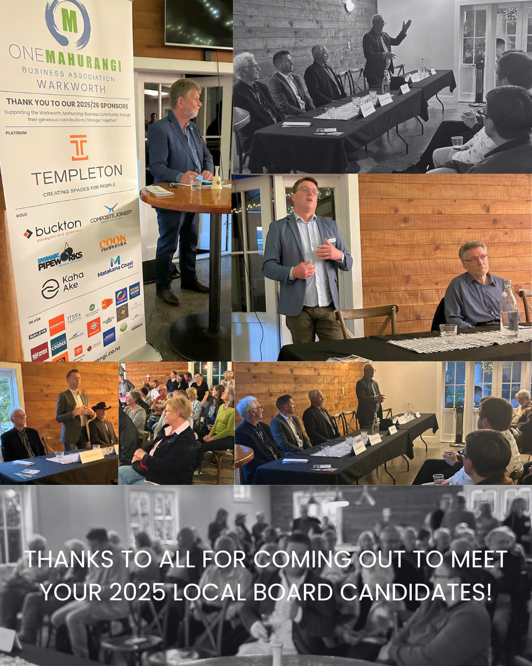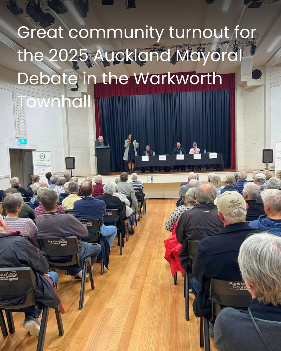 Both the Auckland Mayoral Debate at the Warkworth Town Hall on 10 September and the Local Board Candidates evening at the Bridgehouse on 17 September drew excellent community turnouts, with engaged audiences and plenty of questions from the floor. Rates were a hot topic at the Mayoral Debate, where, despite the current Mayor not attending, the candidates present took part in a robust discussion. The Local Board evening followed with the same positive spirit from previous years, offering locals the chance to hear directly from those standing in the Warkworth Ward and North Rodney Subdivision. Thank you to all candidates and attendees for contributing to two successful events hosted by One Mahurangi. Don't forget to get out and vote!