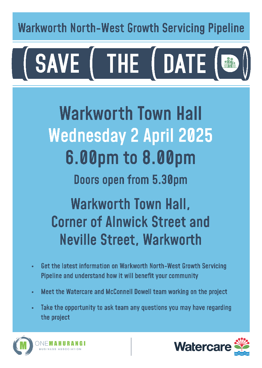 To keep everyone informed, One Mahurangi is hosting a public meeting with senior Watercare representatives, including the Project Director, design engineers, and contractors. This will take place on Wednesday, 2nd April, at Warkworth Town Hall. Doors open at 5.30pm, with the presentation starting at 6pm. There will be plenty of time for questions, and Watercare staff will be available for one-on-one discussions. If your business is affected by the project, this is a meeting you won’t want to miss.