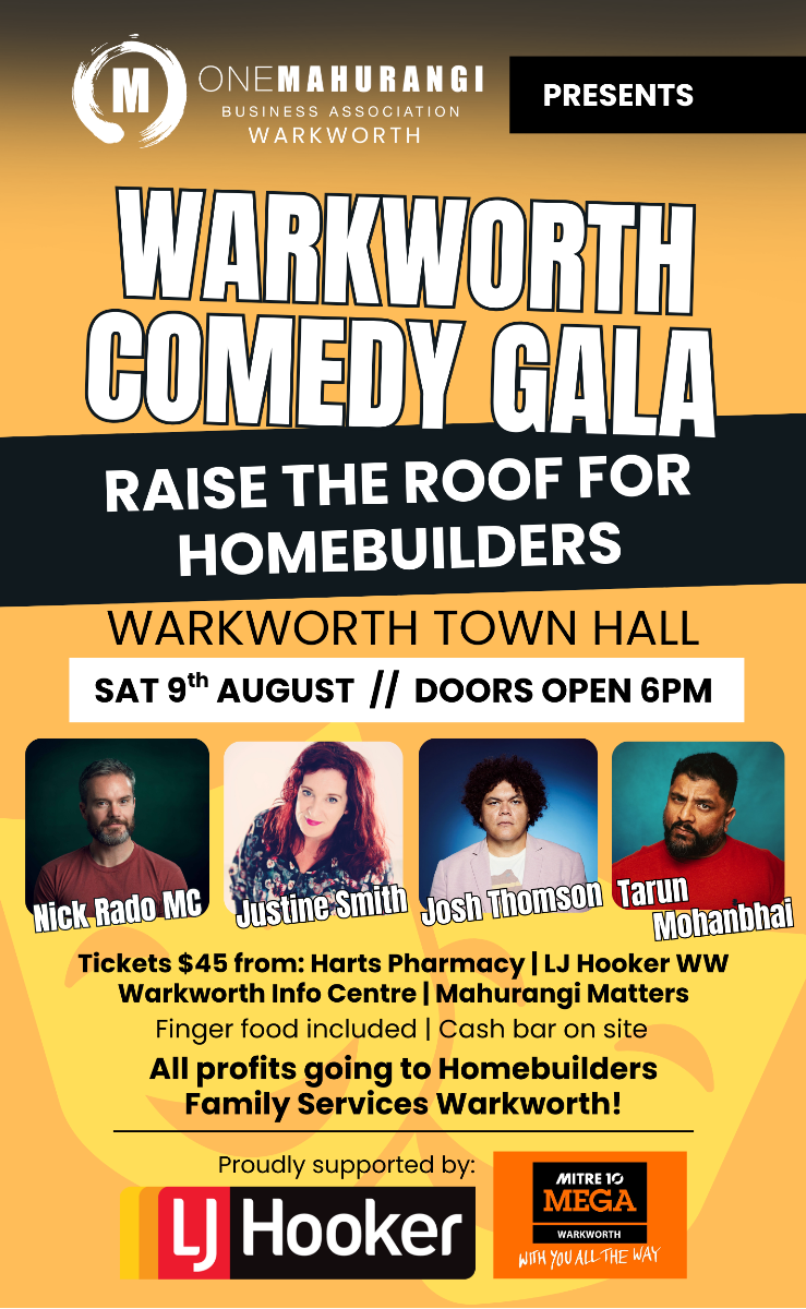 Join us for a night of non-stop laughs in support of a local cause that truly matters. One Mahurangi Business Association presents the Warkworth Comedy Gala, raising funds for Homebuilders Family Services – North Rodney, a charity supporting whānau in need across the Mahurangi region.