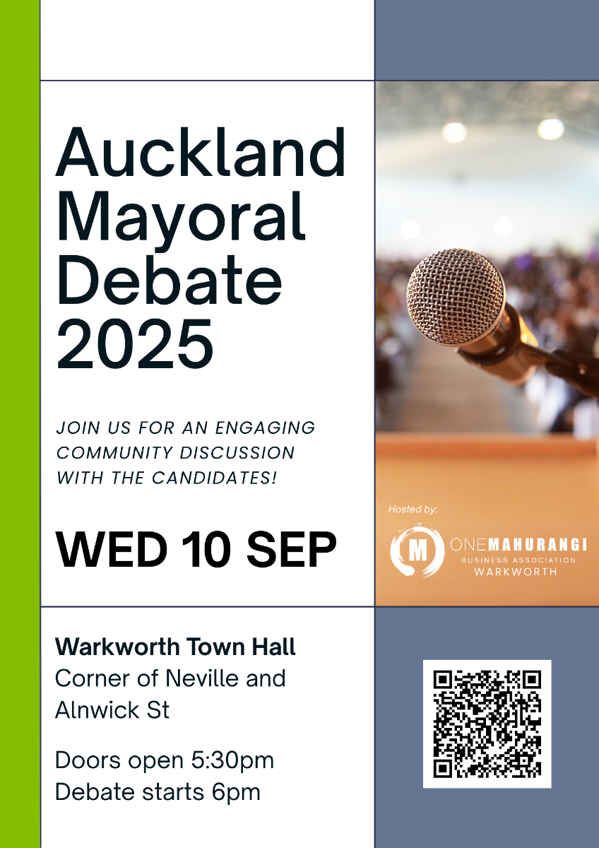 Warkworth has the chance to hear directly from Auckland mayoral candidates. All questions will come from the floor, so this is your opportunity to raise the issues that matter most to our community. Facebook Event listing HERE>