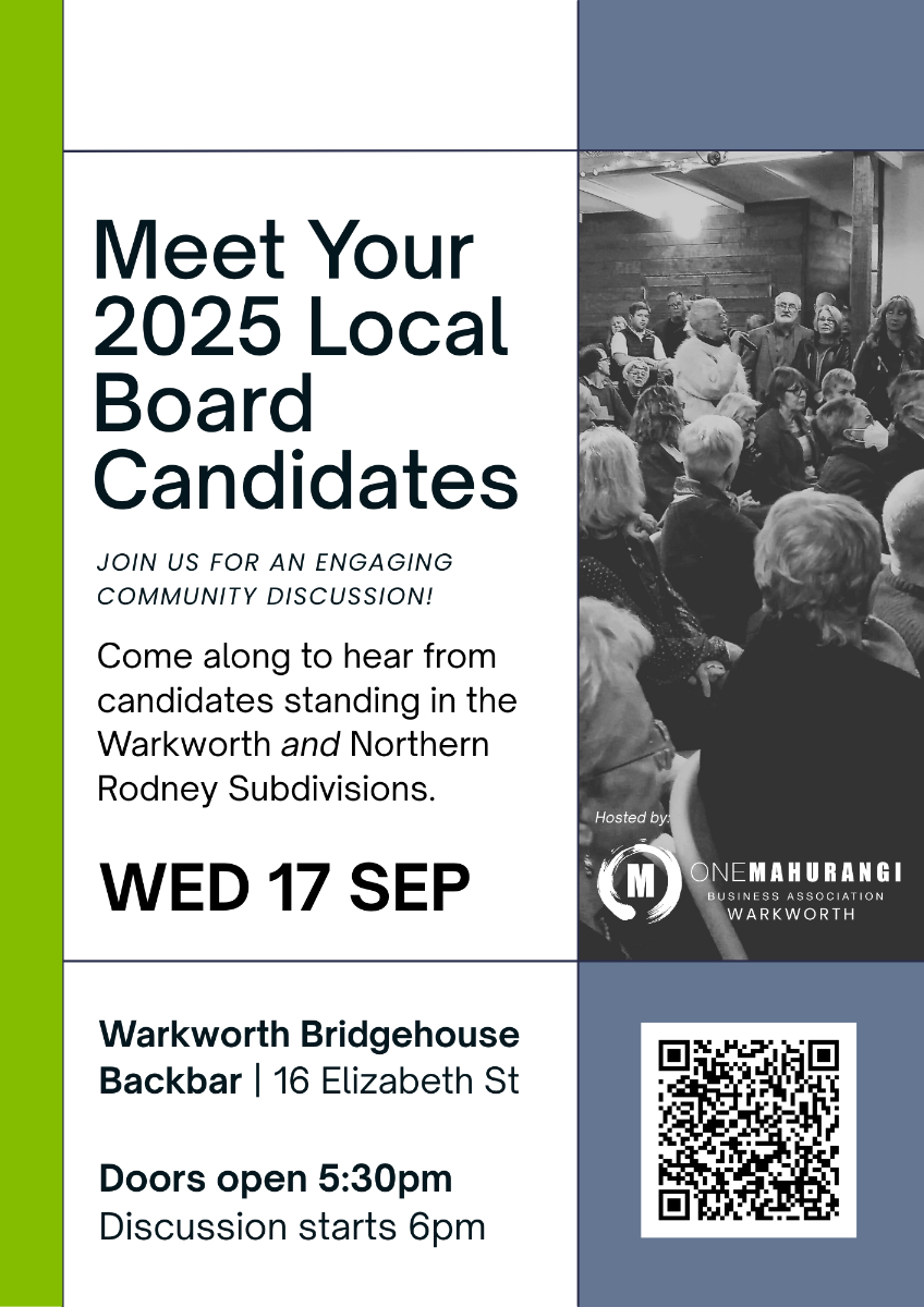 Local Board Candidates 2025 – Wednesday 17 September, Back Bar at the Warkworth Bridgehouse, 5.30pm for a 6pm start