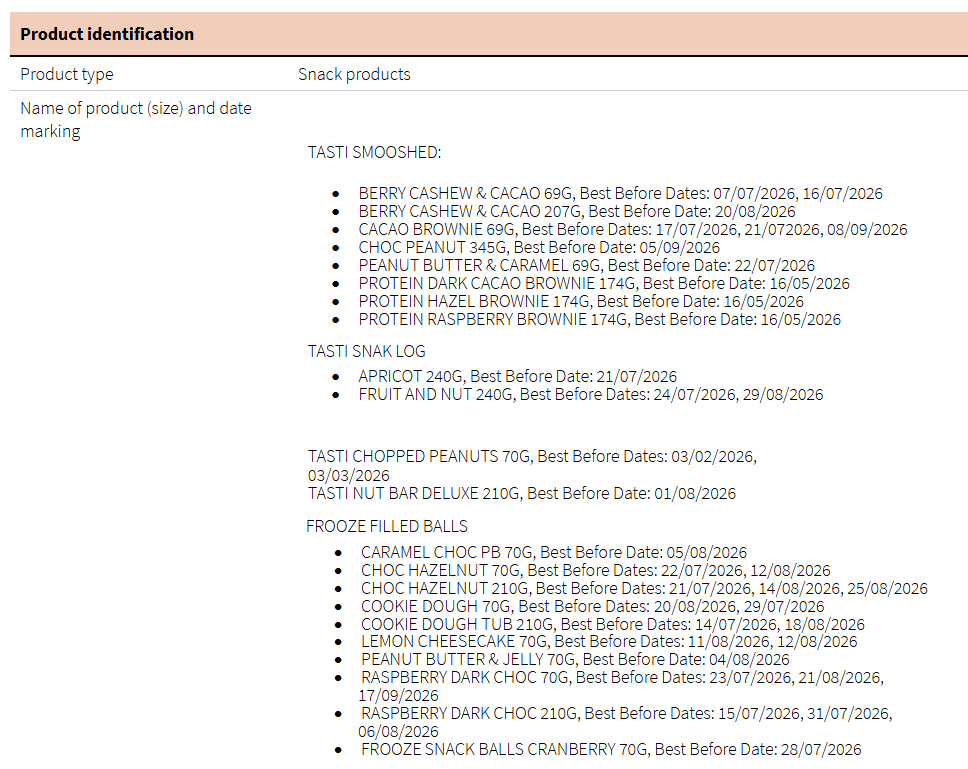 Tasti Products Limited is recalling specific batches of various Tasti brand products as the products may contain foreign matter (small metal pieces).