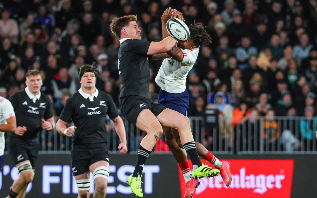 Jordie Barrett Théo Attissogbe challenge for the ball. Photo: Marty Melville / www.photosport.nz