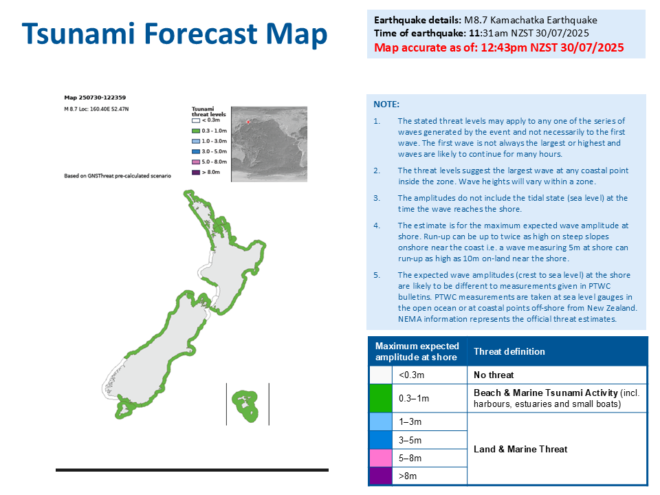 We expect New Zealand coastal areas to experience strong and unusual currents and unpredictable surges at the shore following a magnitude 8.7 earthquake near OFF THE EAST COAST OF KAMCHATKA RUSSIA at 2025-07-30 11:25 AM.