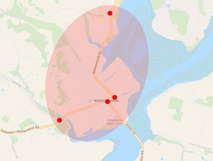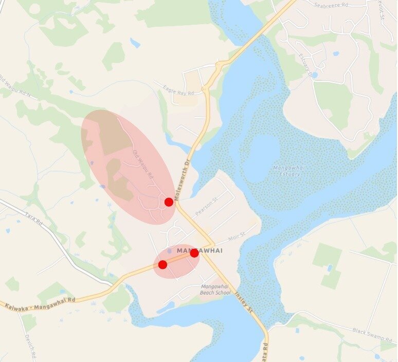 Moir Street between Insley Street and Kagan Avenue/Mangawhai Domain remains closed with an active police cordon in place, as does Old Waipu Road.