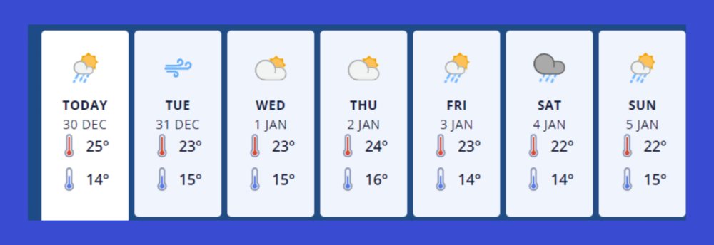 Monday 30th December - Cloud increasing. A few showers from afternoon, clearing for a time this evening. Southwesterlies, strong in exposed places this afternoon.