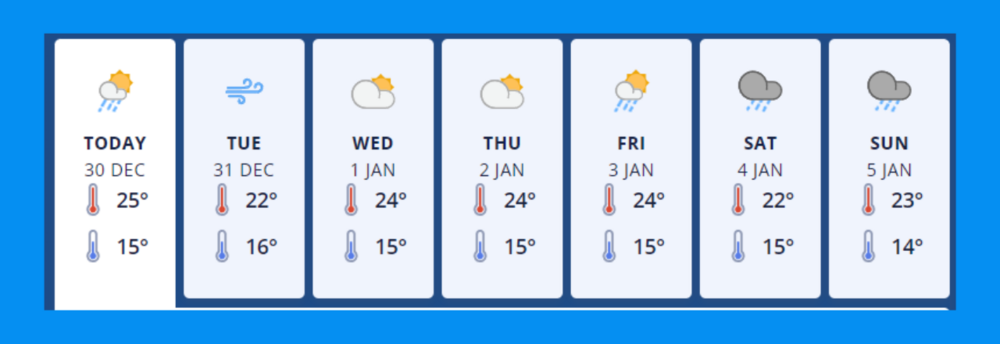 Monday 30th December - Partly cloudy. Showers developing this morning, clearing this evening. Southwesterlies, becoming strong for a time this afternoon.