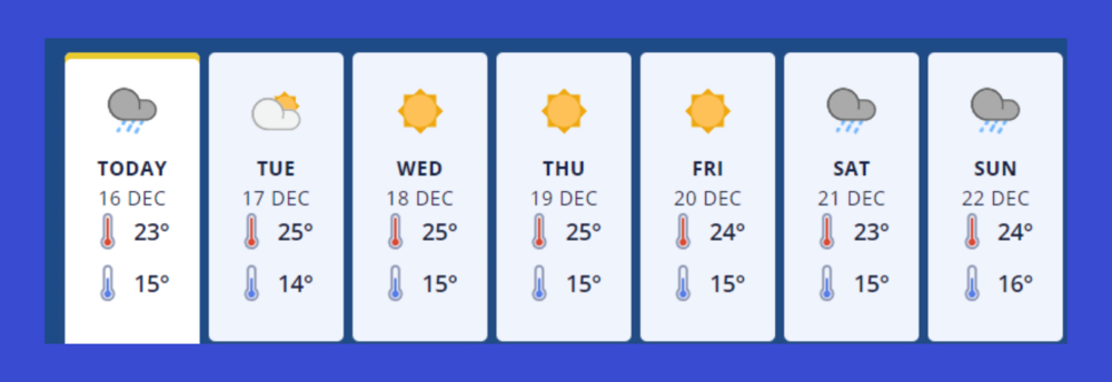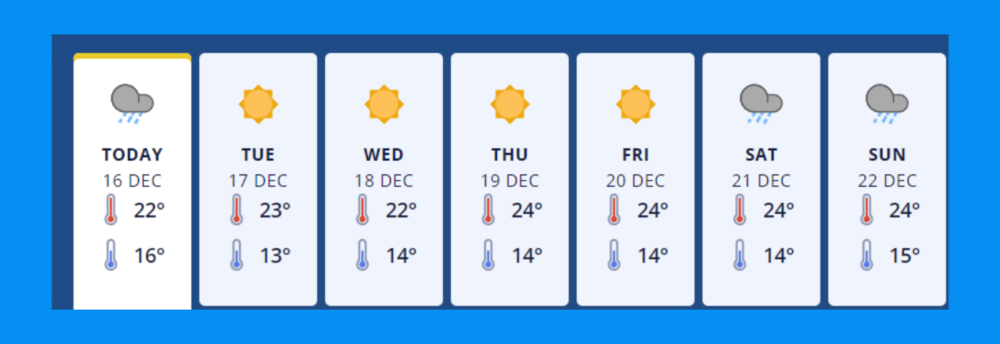 Monday 16th December - Rain, heavy at times with possible thunderstorms and downpours, easing to a few showers this evening. Light winds, evening southwesterlies.