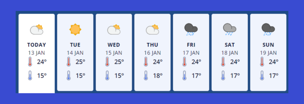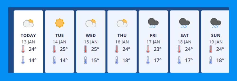 Monday 13th Jan - Fine. Cloud increasing in the west with the chance of a shower towards evening. Southerlies, fresh for a time this afternoon.