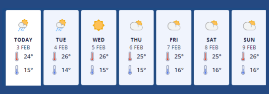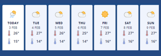 Monday 3rd February - Partly cloudy, a few morning showers. Light winds and afternoon sea breezes.