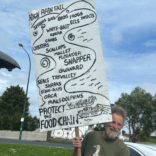 Protesters were visible throughout Wellsford, standing proudly with placards and banners calling for the protection of our land and waterways. While organisers had hoped for a larger turnout, public support was evident — many drivers honked their horns in encouragement, showing how deeply this issue resonates.