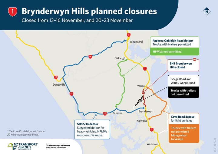 Final resurfacing works on SH1 over the Brynderwyn Hills are planned for November 2025. These planned 4 day super weekend closures are to complete the resurfacing works needed so the road can reopen at 80km/h with passing lanes in time for summer.